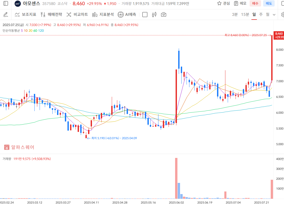 아모센스는 오늘 오전 상한가에 진입하며 주가가 급등했어요. 이후 거래량이 폭발적으로 증가하면서 29.95%나 상승하는 놀라운 모습을 보였죠. 이는 CB 소각 소식과 맞물려 더욱 힘을 받은 것으로 분석됩니다.