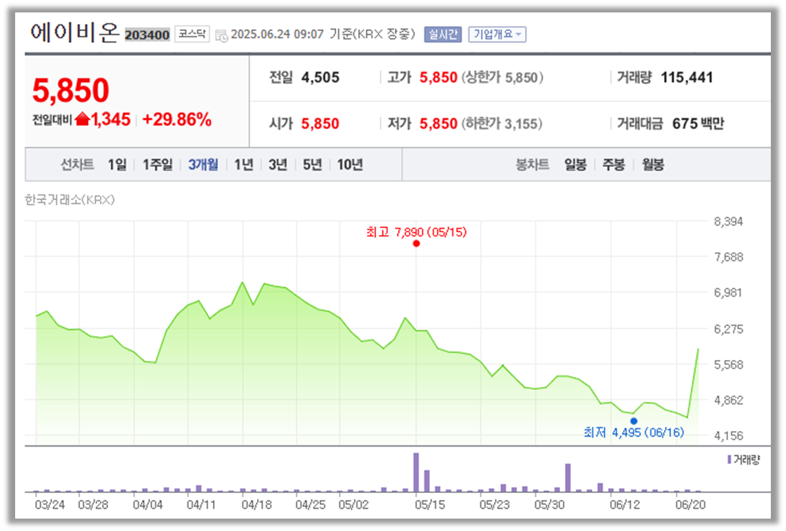 단기 포트폴리오를 구성하려면 시가 총액과 장중 거래량을 살펴봐야 합니다. 에이비온의 시가 총액은 1675억 원이며 장중 거래량은 79,845원 을 기록했습니다. 대주주의 정보는 크게 중요하지 않지만 장기적인 관점에서는 확인이 필요합니다.