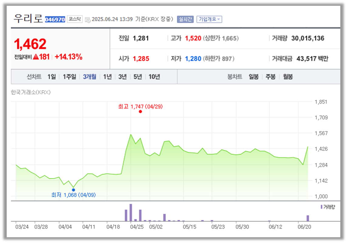 단기 포트폴리오를 구성한다면 시가 총액과 장중 거래량도 살펴봐야 합니다. 우리로의 시가 총액은 640억 원이며 장중 거래량은 858,780원 을 기록했습니다. 대주주의 정보는 크게 중요하지 않을 수 있지만 장기적으로는 확인해보는 것이 좋습니다.