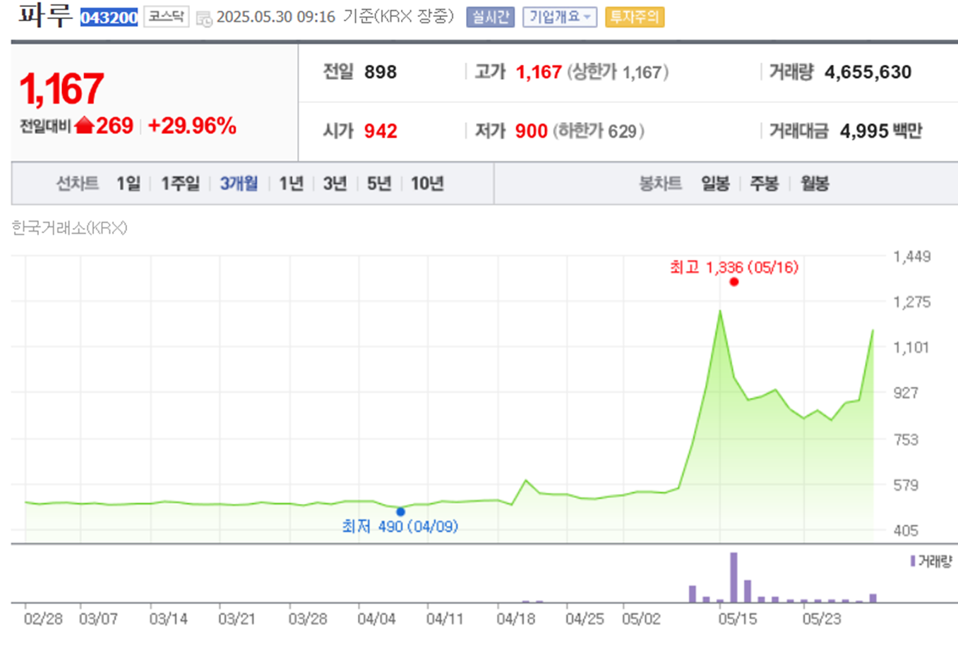 단기 포트폴리오를 구성할 시 시가 총액과 장중 거래량도 살펴봐야 합니다. 파루의 시가 총액은 488억 원이며 장중 거래량은 1,050,196원 을 기록했습니다. 대주주의 정보는 크게 중요하지 않을 수도 있으나 장기적으로는 확인하는 것이 좋습니다.